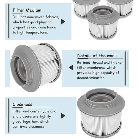 Ncessite un nettoyage et un remplacement rgulierPour une efficacit maximale, ce filtre de piscine de massage doit tre nettoy chaque semaine et remplac au moins une fois par mois. La cartouche filtrante de rechange MSpa limine la salet et les germes et garantit une eau propre et frache. La cartouche filtrante est nettoye plusieurs reprises avec un jet d’eau. Mais s’il reste sale ou sale, il est temps de le changer. .