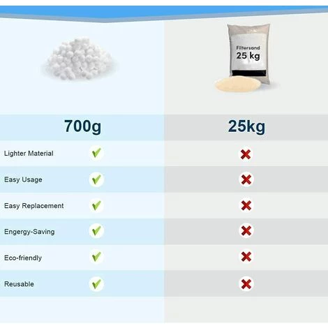 ✔【Économie d’énergie】- En raison de la capacité de filtration plus élevée, le matériau filtrant requis est considérablement réduit, de sorte que 700 g de billes filtrantes suffisent pour remplacer 25 kg de sable de quartz filtré.