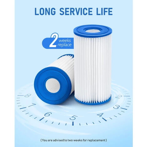 Entretien et remplacement : pour des résultats optimaux, remplacez la cartouche filtrante de la piscine par une nouvelle toutes les deux semaines. Alternativement, frottez le tissu avec un outil de nettoyage de cartouche et rincez avec un tuyau.