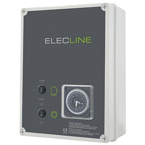 Horloge de programmation journalière, inverseur Manu / 0 / Auto et interrupteur Arrêt / Marche éclairage en façade du coffret.
